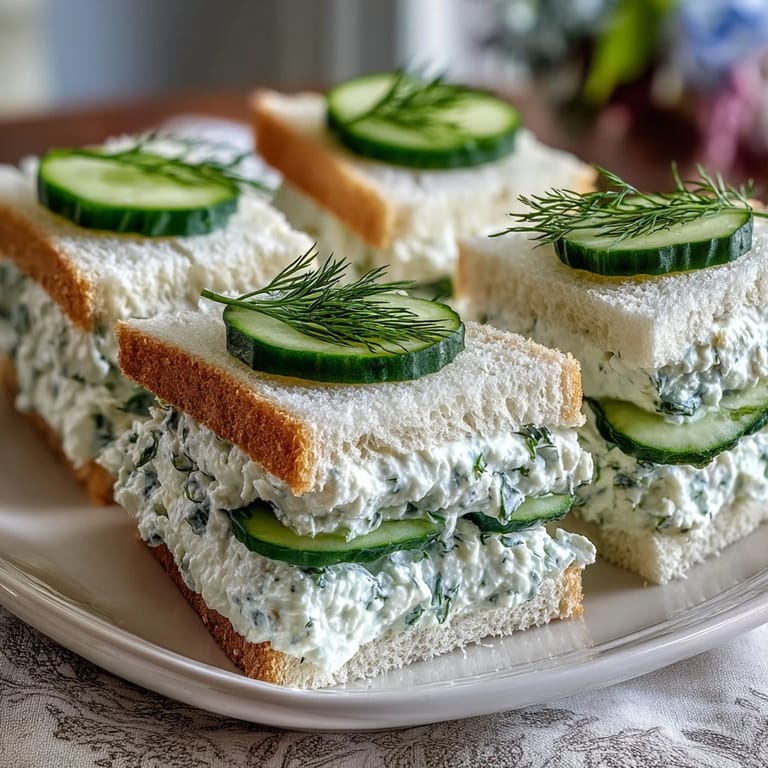 These tea sandwiches are not only delicious but visually appealing when arranged on a platter, garnished with fresh dill to highlight their seasonal charm. The creamy cucumber spread delivers a cooling contrast perfect for warmer weather festivities.